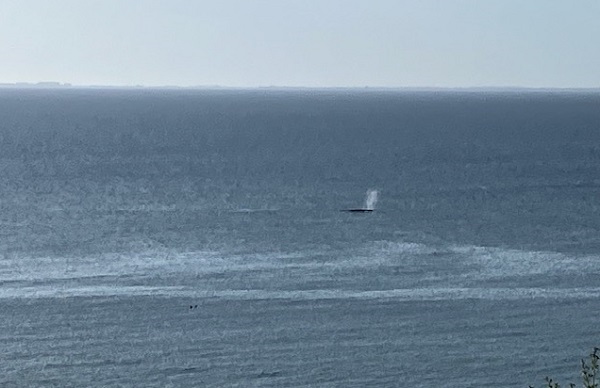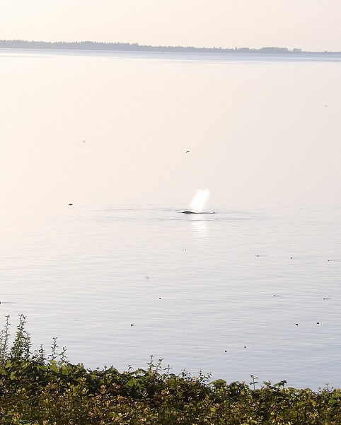 Thor built a (removeable) swinging cabana at the edge of the Wild Zone so we could watch the seabirds, seals, and whales up close. This spring we’ve been lucky to spot several pods of migrating gray whales as they passed close to our home. A couple days ago, while eating dinner on our deck, we first heard loud snorting from the sea, then spotted the spouting whales passing by, surfacing and blowing: