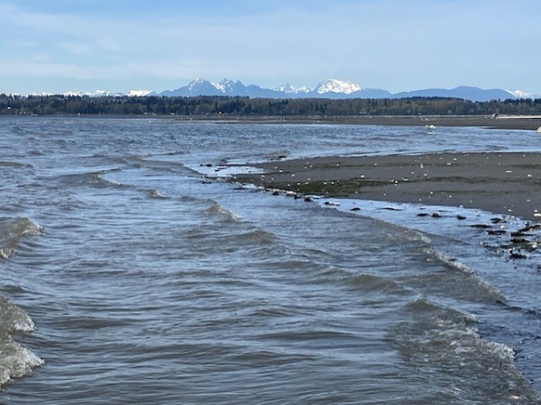 The whales migrate from winter birthing in Baja California to summer feeding in the Arctic. On the way, they cruise into Semiahmoo Bay to feed on the shallow bottom by turning sideways and scraping up small crustaceans. A large pod followed along the other day while I was wading (needed my mermaid fix of the sea) along Semiahmoo Spit, looking toward the Canadian mountains across the bay.