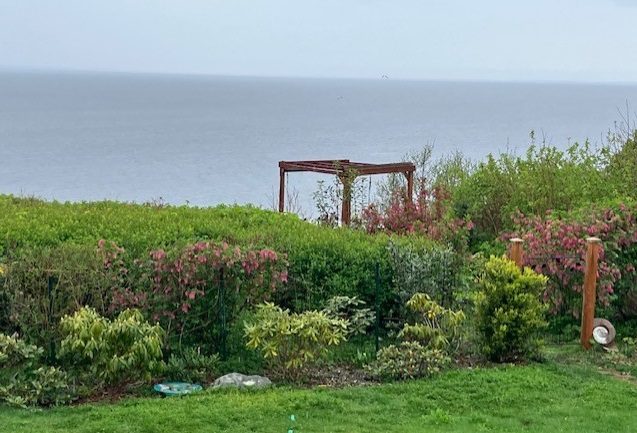 Even as the greedy Powers that Be seem intent on destroying what remains of the natural world, we bear witness to the resilience and beauty of the wild creatures we are so lucky to live among here on the edge of the vibrant sea. When Thor and I acquired this land — a rare high-bank waterfront parcel along Semiahmoo Drive just south of the Canadian border — the previous owner had illegally clearcut, and it was mostly rubble and stumps. The county required us to plant and protect a native-plant buffer, which we call our Wild Zone. We love the beauty of the plants like the pink-blooming wild currant bushes, and so much bird and other animal life it supports.